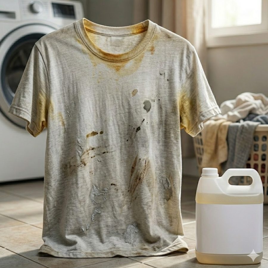 Hậu quả “Áo cháo lòng”: Lớp cặn vô cơ này không thể xả sạch bằng nước, chúng bám ngược trở lại vào sợi vải. Sau vài lần giặt, quần áo trắng sẽ bị ngả màu ố vàng, xám xịt và sợi vải trở nên khô cứng.