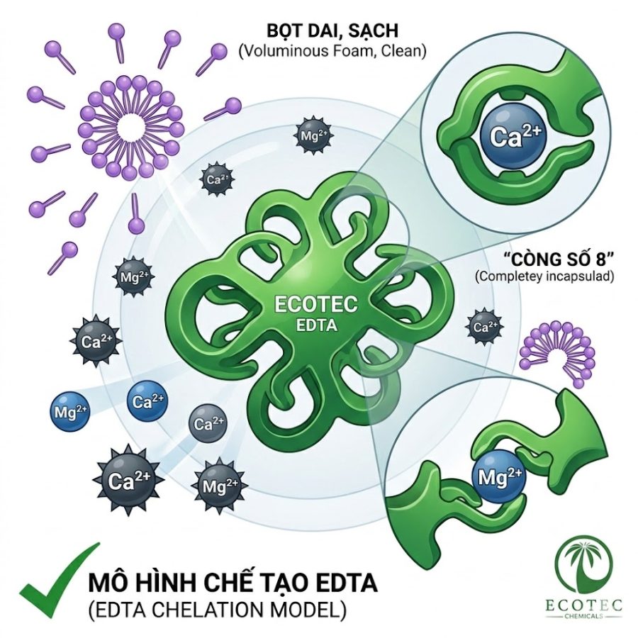 ✅ Cơ chế “Càng Cua” độc đáo: Cấu trúc phân tử của EDTA hoạt động giống như một chiếc còng số 8 với các “răng” sắc bén. Ngay khi được châm vào dung dịch, EDTA sẽ lập tức đi săn lùng các ion Canxi và Magie. Khi phát hiện mục tiêu, nó dùng “càng” quặp chặt lấy các kim loại này, nhốt chúng vào một vòng vây khép kín. 👉 Kết quả: Nước cứng bị “làm mềm” ngay lập tức. LAS và SLES được tự do tung hoành, bọt bung lên dày đặc và dai sức.