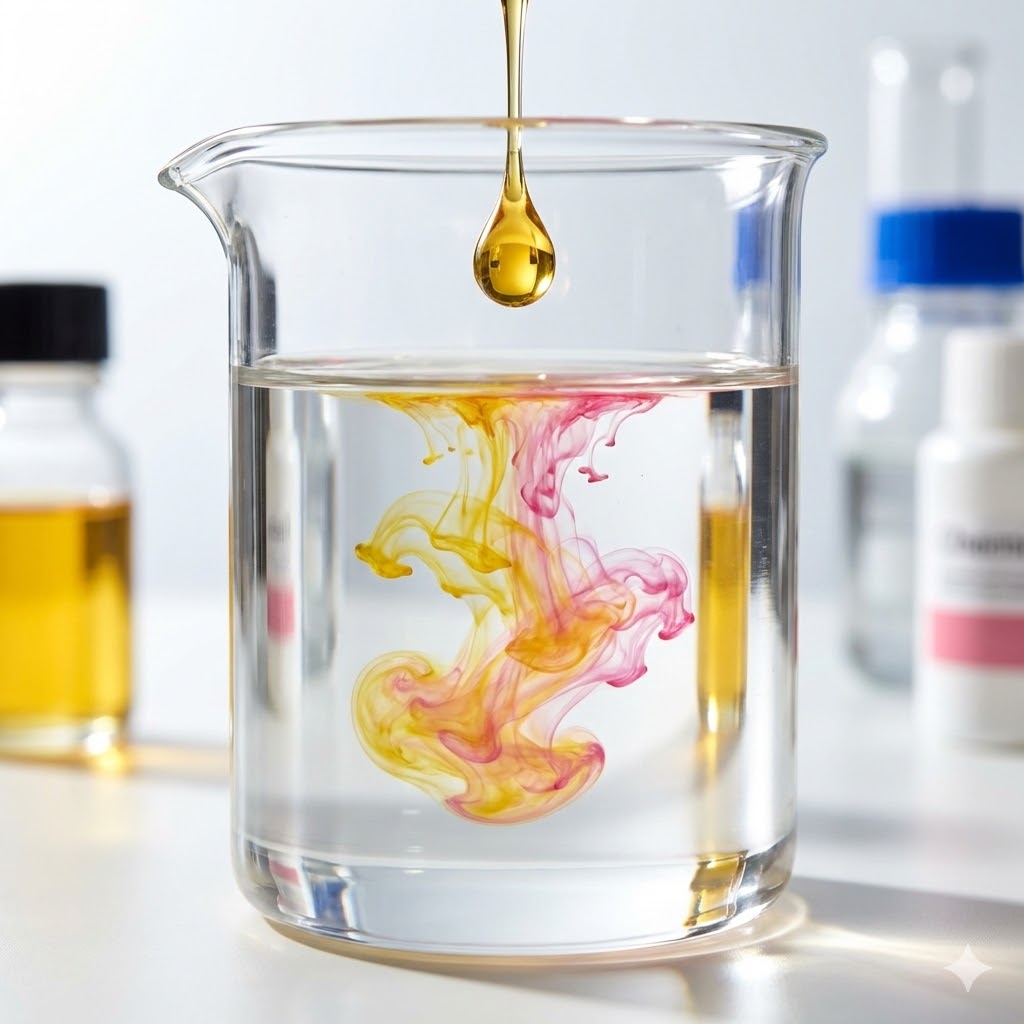 A. Vai trò “Trung gian” (Solubilizer): PEG 400 hoạt động như một dung môi trung gian. Nó bẻ nhỏ các hạt tinh dầu hương liệu, giúp chúng phân tán đều và hòa tan hoàn toàn vào trong nền nước + chất hoạt động bề mặt (SLES/LAS).